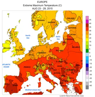 In Süditalien wurden ab 24. August bis 35 Grad gemessen,[194] im Landesinneren Spaniens ab 25. August wieder bis 38 Grad.[195] Dann dehnte sich die Hitze wieder bis auf das Baltikum und an das Schwarze Meer aus (Hoch Karma, dann dort Jessica)[196][197] und vereinigte sich abermals mit der Vorderasien-Hitze. Bis Lettland wurden über 30 Grad gemessen und über 35 Grad wieder in etlichen Gebieten des Balkans, in Rumänien,[198] der Südukraine und der Krasnodar–Kaukasus-Region Südrusslands.