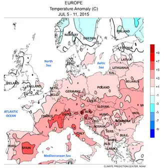 In anderen Teilen Westeuropas wurden ebenfalls ungewöhnlich hohe Maximalwerte der Lufttemperatur gemessen.[33] In Frankreich wurden zahlreiche lokale Rekordtemperaturen bis knapp unter 40 °C verzeichnet,[34][35] die Temperaturen lagen an der Kanalküste bis 20 °C über dem langjährigen Mittel für diese Zeit.[34] An der Wetterstation am Flughafen London Heathrow wurde am 1. Juli 2015 eine Temperatur von 36,7 °C gemessen und damit der bisherige Juli-Rekord für Großbritannien überschritten.[36][37][29] In den Niederlanden wurde mit 38,2 °C in Maastricht am 2. Juli der heißeste Julitag überhaupt und die dritthöchste je gemessene Temperatur in den Niederlanden verzeichnet.[38][37]