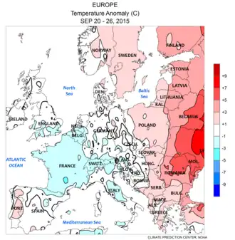 - ↑ a b c Global average temperature record high for August, June–August, and January–August; Separately, global oceans and global land were both highest on record for these periods of time. Global Summary Information - August 2015. Und Regional Analysis - August 2015. beide NOAA Climate reports.