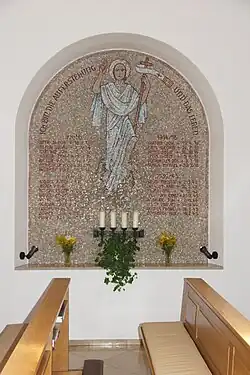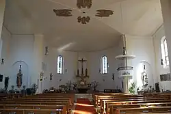 Die Kirche von 1933 war sehr spärlich ausgestattet. Zwei Barockaltäre wurde aus Altbeständen gekauft. Der Hauptaltar enthielt eine Darstellung der Heiligen Familie, daneben waren Figuren der hl. Barbara und der hl. Katharina aufgestellt. Der Seitenaltar enthielt eine Muttergottes mit Kind. Beide Altäre wurden während des Zweiten Weltkrieges entfernt und sind nicht mehr auffindbar, die beiden Heiligenfiguren blieben hingegen erhalten. 1943 fertigte der Bildhauer Martini aus Regensburg einen neuen Hauptaltar mit einer Kreuzigungsgruppe und einen neuen Seitenaltar mit einer geschnitzten Darstellung der Heiligen Familie. Der Kunstmaler Platzek aus Regensburg hat über dem Altar die Heilige Familie mit vier Engeln in Freskotechnik aufgemalt. Dieses Werk wurde 1963 übertüncht, erhalten blieben nur die Bildnisse der vier Engel. 1963 gestaltete der Bildhauer Max Scheler aus Altenthann für den linken Seitenaltar eine zwei Meter große Marienfigur mit Jesuskind und 1965 für den rechten Seitenaltar eine große Josefsstatue.