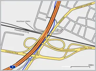 | Querung von | Münchner Nordring, U-Bahn Linie 6, Verbindungsgleis Nordring–U-Bahn, Frankfurter Ring, Zubringer zum Föhringer Ring, weitere Wege und Nebenstraßen | |