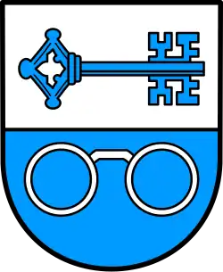 Blasonierung: „In von Silber und Blau geteiltem Schild oben ein blauer Doppelschlüssel, unten ein brillenförmiges silbernes Gemarkungszeichen.“ |