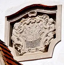 An der südlichen Längsseite ist ein kleiner Eingangs-Vorbau mit Figurennische im geschweiften Giebel angefügt, und über diesen ist an der Langhauswand ein Wappen angebracht, das von der baulichen Erneuerung 1734 zeugt. Die Inschrift lautet: "SVB AVSPICIO REGIMINE ILLVST(RI) D(OMINI) D(OMINI) / MAXIMIL(IANI) MARIAE S(ACRI) R(OMANI) I(MPERII) DAPI(FERI) E(T) COMITIS / DE WOLFFEGG WALDSEE ECCLE/SIA HAEC FVIT RENOVATA 1734" - unter der Verantwortung und der Regierung des vornehmen Herrn, des Herrn Maximilian Maria, des Heiligen Römischen Reiches Truchseß und Graf von Wolfegg-Waldsee, wurde diese Kirche 1734 erneuert. Bei dem Genannten handelt es sich um Erbtruchseß Maximilian Maria Graf von Waldburg zu Wolfegg (geb. 1684, gest. 1748) aus der Linie Waldburg-Wolfegg-Waldsee. Der Enkel des Bauherrn wurde 1803 in den Fürstenstand erhoben und führte diese Linie als Fürstenhaus Waldburg-Wolfegg-Waldsee weiter.