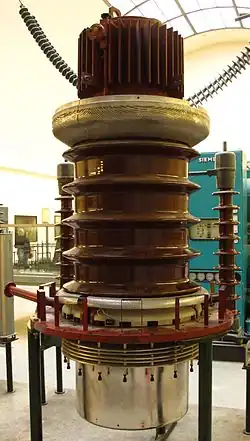 Der erste Versuch einer Fernübertragung mit Gleichstrom fand 1882 von Miesbach nach München statt. Kleinere und eher der Mittelspannung zuzurechnende Anlagen entstanden ab den 1890er Jahren besonders in Italien und der Schweiz, beispielsweise St-Maurice–Lausanne (22 kV, 3,7 MW, 56 km; 1902).[15] Die erste HGÜ-Anlage war das Lyon–Moûtiers-System mit einer 180 km langen Freileitung bei 100 kV bipolarer Spannung und 14,7 MW Übertragungsleistung im Endausbau. Die Anlage war von 1906 bis 1936 in Betrieb und funktionierte ohne Umrichtwerke. Die elektrische Energie wurde mittels in Reihe geschalteter Gleichstromgeneratoren direkt in einem Wasserkraftwerk in Pomblière bei Moûtiers erzeugt und von Gleichstrommaschinen in Lyon zum Betrieb der elektrischen Straßenbahn umgesetzt.[16] All diese Anlagen basierten auf elektro-mechanischen Umformern. Erst in den 1930er Jahren wurden Anlagen mit Stromrichtern entwickelt.