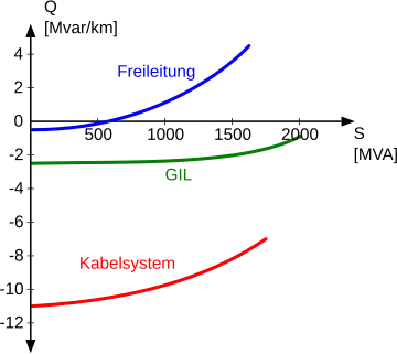 (induktiv; bewirkt einen um 60 % höheren Stromfluss und um 160 % höhere ohmsche Verluste). - Bei einem Kabelsystem beträgt die gesamte Blindleistung 500 km · 8 Mvar/km = 4000 Mvar