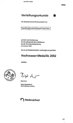 - ↑ Beschluss der Landesregierung vom 26. November 2002 über die Stiftung einer Hochwasser-Medaille 2002, Niedersächsisches Ministerialblatt Nr. 53 vom 5. Februar 2003 Artikel III
