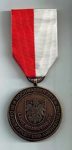 - ↑ Erlass des Ministerpräsidenten des Landes Brandenburg über die Stiftung der Einsatzmedaille "Hochwasser 2013" vom 21. November 2013, Amtsblatt für Brandenburg Nr. 52 vom 18. Dezember 2013, Artikel I