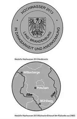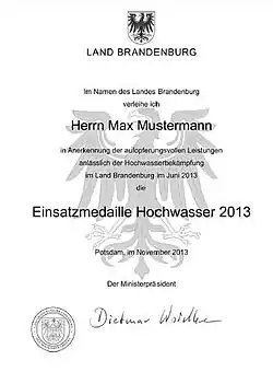 - ↑ Erlass des Ministerpräsidenten des Landes Brandenburg über die Stiftung der Einsatzmedaille "Hochwasser 2013" vom 21. November 2013, Amtsblatt für Brandenburg Nr. 52 vom 18. Dezember 2013, Artikel III