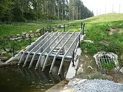 Querschnitt des Staudamms am Hochwasserrückhaltebecken Jonenbach[7] (1): Durchlass, (2): Hochwasserentlastung mit Schwemmholzrechen, (3): Grundablass (Einlauf) mit Rechen und Einlassdrosselung, (4): Auslaufbauwerk mit Fischtreppe, (5): Tosbecken (schnell fließendes Wasser wird verlangsamt), (6): Fußweg, (7): Dammkrone