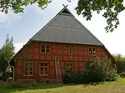 - der Scheune von 1825 mit seitlicher Längseinfahrt mit Ausfachungen aus Klinkern, an das Wohnwirtschaftsgebäude angebaut, mit Steinausfachungen, Krüppelwalmdach und Niedersachsengiebel mit Uhlenloch und Pferdeköpfen am First,