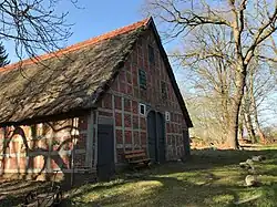 - dem eingeschossigen traufständigen Wohn- und Wirtschaftsgebäude von 1848 (Inschrift) als Zweiständer-Hallenhaus in Fachwerk mit Steinausfachungen, mit reetgedecktem Satteldach, Uhlenloch, Ladeluke und Grooter Door mit Korbbogen; 1905 (Inschrift) wurde die Diele um zwei Fach verlängert,[2]
