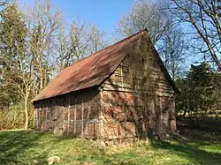 - der traufständigen Scheune von 1882 (Inschrift) in Fachwerk mit Steinausfachungen, Satteldach und mittiger Querdurchfahrt sowie horizontaler Verbretterung im Giebeldreieck.[3]