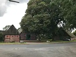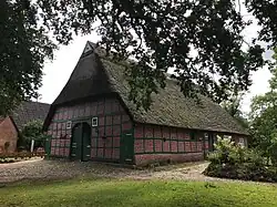 - dem eingeschossigen, giebelständigen Wohn- und Wirtschaftsgebäude von 1844 (Inschrift) als Zweiständer-Hallenhaus in gleichmäßigem Gitterfachwerk mit Steinausfachungen, reetgedecktem Krüppelwalmdach, Uhlenloch und der Grooten Door mit Korbbogen; das Innengerüst im Dielenbereich blieb erhalten, der Wohnteil wurde massiv ersetzt,[2]