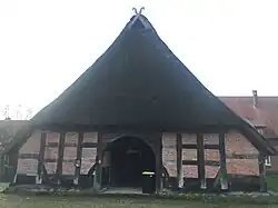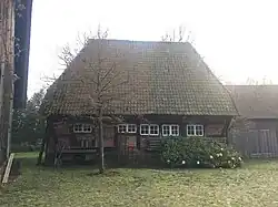 - dem eingeschossigen giebelständigen Wohn- und Wirtschaftsgebäude von 1640 (Inschrift) als Zweiständer-Hallenhaus in Fachwerk mit Steinausfachungen reetgedecktem Krüppelwalmdach, Niedersachsengiebel mit Uhlenloch, Pferdeköpfen und der Grooten Door mit Rundbogen, sowie mit Vorschauer, Diele, Flett und abgeschlossenem Kammerfach; das Innengerüst mit mächtigen Ständern ist nahezu vollständig erhalten,[1]