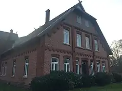 - dem eingeschossigen Wohnhaus von 1910 (Inschrift) in Backstein mit Drempel, Satteldach, Uhlenloch und Pferdeköpfen als Anbau an das Wohn- und Wirtschaftsgebäude; verzierte Fassaden mit Gesimsen und segmentbogenförmigen Öffnungen,[1]