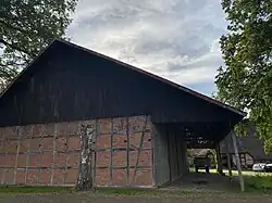 - der neuen Scheune von 1910 in Fachwerk mit Steinausfachungen, flachem ziegelgedecktem Satteldach, drei Querdurchfahrten, vertikal verbrettertem Westgiebel und Giebeldreieck nach Osten sowie Anschleppung über die gesamte nördliche Traufseite,[1]