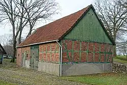 - dem eingeschossigen giebelständigen Wohn- und Wirtschaftsgebäude von 1833 (Inschrift) als Zweiständer-Hallenhaus in gleichmäßigem Fachwerk mit Steinausfachungen, mit reetgedecktem Krüppelwalmdach als Niedersachsengiebel mit Uhlenloch und Grooter Door mit Korbbogen,[2]