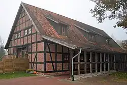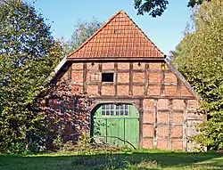 - dem Wohn- und Wirtschaftsgebäude von um oder vor 1900 als Zweiständer-Hallenhaus in Fachwerk mit Steinausfachungen und Satteldach mit 6 Schleppgauben sowie Schleppdach, Dielengerüst und Flett (frühere Küche) erhalten, erhaltene Inschrift im Dielentor von 1812, umgebaut zu einem Wohnhaus,