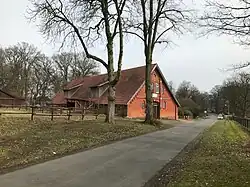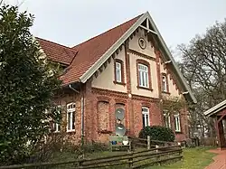 - dem eingeschossigen giebelständigen Wohn- und Wirtschaftsgebäude von um 1895 als Zweiständer-Hallenhaus in Backstein, mit ziegelgedecktem Satteldach, Inschrift und Grooter Door mit Segmentbogen sowie Schmuckformen in Backstein,[2]