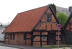 - dem eingeschossigen Wohn- und Wirtschaftsgebäude von 1621 (Inschrift) als niederdeutsches Zweiständer-Hallenhaus (12,15 × 21,50 m groß) in Fachwerk mit Steinausfachungen und einem ziegelgedeckten Krüppelwalmdach als Niedersachsengiebel mit Uhlenloch und Pferdeköpfen sowie mit beidseitig reich verziertem Renaissancegiebel mit der (später rundbogigen) Grooten Door und Balkeninschrift für die Erbauer „Heinrich Wilkens – Allheit Wilkens“, eingefasst mit den Wappen mit Zange und Hammer, mit vorstehenden Stichbalken, gestützt durch geschweifte Knaggen, und mit rankenverzierten Füllhölzern zwischen den Stichbalken und der Giebelschwelle sowie an der unteren Kante ein Zahnschnittfries sowie mit einem einfacheren rückseitigen Wohngiebel,