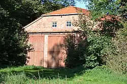 - der Scheune, teils in Fachwerk und massiven verklinkerten Giebel, mit Krüppelwalmdach und Längs- sowie Querdurchfahrten (evtl. um 2018 abgerissen),