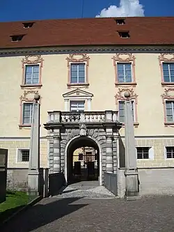 Die Außenfassaden haben zwischen dem Erdgeschoss und den Obergeschossen ganz unterschiedlichen Charakter. Das Erdgeschoss besitzt nur kleine vergitterte Fenster und ist rustikagequadert, wirkt also wie eine wehrhafte Burg, während an den Obergeschossen große stuckgerahmte Fenster mit Kartuschenbekrönungen den Schlosscharakter des Gebäudes repräsentieren. Es wird vermutet, dass Johann Martin Gumpp der Ältere die Leitung der Fassadengestaltung und der Ausstattung innegehabt hat.