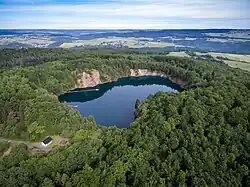 - In dem ehemaligen Basaltsteinbruch auf dem Burgkopf oberhalb des Dorfes liegt ein kleiner See mit klarem Wasser, der für die Öffentlichkeit nicht zugänglich ist, von einem Angelverein genutzt wird und rundum abgezäunt ist.