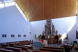 - Der Kapelleninnenraum hat eine Größe von 14,80 × 11,32 m. Die Höhe vom Fußboden bis zur Giebelspitze beträgt 10,80 m. Auf dem Boden ist eine 30 cm hohe, 3,70 m breite und 7 m lange Estrade eingebaut, auf der Hoch- und Zelebrationsaltar stehen. Der Hochaltar stammt aus der alten Kapelle und wurde vor der Wiederaufstellung von Restaurator Walter Dick, Wasenbach, renoviert, wobei auf Sockelaufbau und Türwänden des ehemaligen Sakristeiverschlages alte Malereien freigelegt wurden. Den Altar krönt das Wappen des Johanniterordens Adenau. Der Zelebrationsaltar wurde von Bildhauer Georg Gehring, Adenau, gestaltet. Es ist ein Steinblock aus Anröchter Dolomit in den Maßen 120 × 90 × 100 cm. Die Eckausarbeitungen zeigen ein Weinblatt mit Traube. An den beiden Längsseiten sind Wandbänke auf Steinwangen eingebaut. Die übrigen Sitzbänke stammen aus der alten Kapelle.