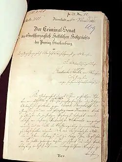 - ↑ Art. 1 Einführung des mündlichen und öffentlichen Strafverfahrens mit Schwurgericht in den Provinzen Starkenburg und Oberhessen betreffend vom 28. Oktober 1848. In: Großherzoglich Hessisches Regierungsblatt Nr. 65 vom 17. November 1848, S. 405–468.