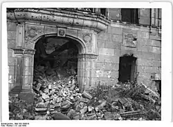 Stoppte der Kriegsausbruch vorerst die Räumung des Hoffmann-Hauses, musste sich die Deutsche Chemische Gesellschaft bald mit den Kriegsfolgen in Form der Bedrohungen durch den einsetzenden Luftkrieges auseinandersetzen. Am 10. August 1943 erhielt sie die Genehmigung des Reichsforschungsrates zur Verlagerung der Bibliothek, der Ölgemälde und der historischen Sammlung in einen Stollen des Kalkbergwerkes in Rüdersdorf bei Berlin. Die Geschäftsstelle bezog im November 1943 Räumlichkeiten im Gasthof Goldene Traube in Rüdersdorf.[43] Im April 1945 beschlagnahmte die Rote Armee die eingelagerte Bibliothek.[44] Sie wurde nach Moskau gebracht und erst im Oktober 1956 kehrten 25 300 Bände[45] in die Obhut der Chemischen Gesellschaft der DDR zurück.[46] Nach deren Auflösung 1990 ging die Hofmann-Bibliothek an die Universitätsbibliothek der Humboldt-Universität zu Berlin.[47] Die Auslagerung erfolgte noch rechtzeitig vor dem ersten schweren alliierten Bombenangriff auf das Tiergartenviertel in der Nacht vom 22. zum 23. November 1943. Während die übrigen Häuser in der Sigismundstraße weitgehend zerstört wurden, blieben das Hofmann-Haus und die angrenzende Villa Parey abgesehen von Fenster- und Glasschäden weitgehend verschont.[48] Dies weckte Begehrlichkeiten der obdachlos gewordenen Reichsstelle Chemie und der Wirtschaftsgruppe Chemie, die sich Ende November 1943 um die Beschlagnahmung des Gebäudes zu ihren Gunsten bemühten.[48] Als Folge des Angriffs verlagerte sich die Redaktion des zweiten Beilstein-Ergänzungswerkes für die Literatur bis 1930 nach Zobten, heute Sobótka in Schlesien.[49] Beim Bombenangriff in der Nacht vom 28. zum 29. Januar 1944 zerstörten Brand- und Sprengbomben das Gebäude zu 60 % bis zur ersten Etage.[50] So verlagerte sich auch die Redaktion des dritten Beilstein-Ergänzungswerkes, das die Literatur bis 1950 abdecken sollte, in die Umgebung von Berlin und lediglich die Dokumentationsstelle verblieb im Erdgeschoss.[49] Eine provisorische Überdachung der Halbruine wurde abgelehnt, aber ab April 1944 war auch die erste Etage provisorisch wieder nutzbar.[51] Der reduzierte Betrieb dauerte noch bis März 1945, Ende April/Anfang Mai setzten entweder Wehrmacht oder die SS die Reste des Gebäudes Brand und zerstörten es endgültig.[52] Die Ruinen wurden zu Beginn der 1950er abgetragen und die Grundstücke geräumt. Mit künstlichen Trümmern versehene diente es 1957 zusammen mit der Villa Parey als Drehort für einige Szenen im Film The Young Lions mit Marlon Brando, Montgomery Clift und Maximilian Schell. In der Nachkriegszeit gingen die Geschäfte der durch ein Kontrollratsgesetz stillgelegten Deutschen Chemischen Gesellschaft im Wesentlichen auf die Gesellschaft Deutscher Chemiker über. In einer 1953 erstellten Vermögensaufstellung wurde als Wert des Grundstücks noch 98.500 Mark eingesetzt. 1960 wurde das Grundstück mit anderen Vermögenswerten auf die Gesellschaft Deutscher Chemiker übertragen, die es 1969 an das Land Berlin verkaufte.[53] Heute steht auf dem Grundstück und den benachbarten Flächen die 1998 fertiggestellte Gemäldegalerie.