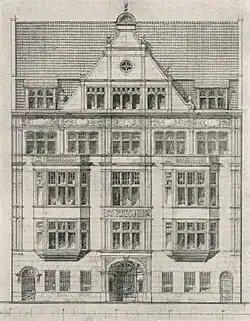 Das Baumaterial – heller schlesischer Sandstein[13] – und den Stil – deutsche Renaissance – hatten die beiden Bauten dagegen gemeinsam. Ein in Feldern gegliederter Renaissance-Giebel in der Mittelachse bekrönte die Fassade des fünfgeschossigen Hauses. Das Erdgeschoss und die untergeordneten Etagen im 3., 4. und 5. Geschoss wiesen mit 3,8 m eine geringere Höhe auf als die beiden Hauptgeschosse in der 1. Etage mit beinahe 4 m und in der zweiten Etage mit 4,8 m. Ein Korbbogen überspannte den Haupteingang in der Mittelachse. Zwischen den dreiteiligen Mittelfenstern des ersten und zweiten Obergeschosses prangte die Inschrift HOFMANN-HAUS vor dem Hintergrund eines ornamentalen Frieses. Zwei breite Erker rechts und links dieser Mittelfenster verbesserten den Lichteinfall in den Hauptgeschossen und sorgten für gute Lichtverhältnisse in den Räumen der Redaktion, der Geschäftsstelle und der Bibliothek. Zudem ließ March die Straßenfenster aus Eisen schmieden, um möglichst große Lichtöffnungen zu erzielen.[14] Im dritten Geschoss gingen die Erker in Balkone über und die wesentlich kleineren Fenster folgten einer anderen Anordnung. Über diese Fenster zog sich ein weiterer Fries und eine Kartusche in der Mittelachse hielt das Baujahr 1899 fest. Das Dach war eingedeckt mit roten, unglasierten Ziegeln.[14] Die Hoffassaden erhielt eine Verblendung aus hellgrauen Verblendersteinen.[13]