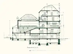Das Gebäude gliederte sich in ein fünfgeschossiges Vorderhaus, das im Wesentlichen die selbst genutzten und vermieteten Geschäftsräume aufnahm, und ein dreigeschossiges Hinterhaus mit dem über zwei Geschosse reichenden Hörsaal. Wegen des hohen Grundwasserspiegels wurde das Haus nur teilweise unterkellert.[12] Der Keller diente als Lager für Gerätschaften und nahm die technischen Installationen für Heizung und Lüftung auf. Die Warmwasserheizung lieferte die Firma Rietschel & Henneberg. Die elektrisch betriebene Lüftungsanlage für den Hörsaal der gleichen Firma saugte die Luft im Hof an, filterte und erwärmte sie bei Bedarf und ließ sie unter den Setzstufen im Hörsaal austreten. Die Abluft wurde durch Öffnungen im hölzernen Fries der Oberlichtdecke abgesaugt. So ließ sich die Luft im Hörsaal halbstündlich erneuern.[13]