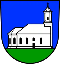 Blasonierung: „In Blau auf grünem Schildfuß eine silberne Kirche in Seitenansicht mit hinten angesetztem Turm mit Achtkantaufsatz.“