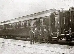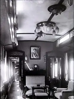 - Die Wagen wurden in der Werkstatt der Eisenbahn Moskau–Nischni Nowgorod (später: Transsibirische Eisenbahn) gebaut, die Inneneinrichtung nahm die Moskau–Kursker Eisenbahn selbst vor.[16] Die Wagen des Zuges waren untereinander mit Faltenbälgen aus Leder verbunden, die nach innen mit Filz isoliert und textil verkleidet waren. Beheizt wurden die Wagen durch sechs über den Zug verteilte Dampfkessel, von denen jeder zwei oder drei Wagen versorgte.[Anm. 1] Die Innenbeleuchtung bestand noch aus Stearinkerzen. Nach Bedarf wurden weitere Fahrzeuge in die Hofzüge eingestellt, die dem Fahrzeug-Pool entnommen wurden, den die Bahn für den öffentlichen Verkehr unterhielt.[1]
