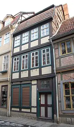 Das dreigeschossige Fachwerkhaus ist im Denkmalverzeichnis Quedlinburgs als Wohnhaus eingetragen. Die Fachwerkfassade ist mit einer Profilbohle, die Gefache mit Zierausmauerungen versehen. Bedeckt ist das Gebäude mit einem Mansarddach. Es entstand in der Zeit des Barock um 1750. Die Haustür ist im Stil des Rokoko gestaltet und mit einem aufwendig gestalteten Oberlicht versehen.