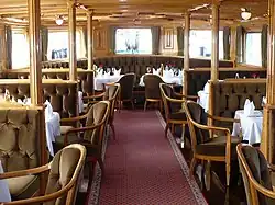 Dunkles Teakholz, glänzendes Messing, die Schiffsglocke,[10] die Dampfmaschine, die roten Schaufelräder und das Rettungsboot aus Holz schaffen ein besonderes Ambiente.[11] Beim seitlichen Zutritt ab Anlegestelle zum Schiff gelangt man zuerst in den salonartigen Mittelteil. Von dort kann man die Treibstangen, den Kurbeltrieb, die die Schaufelräder antreibende Welle und hinter Glas die seitlichen Schaufelräder betrachten. Dieser Raum mit seitlicher Bordküche hat freie Sicht nach vorne. Zum barähnlichen Raum im Vorderteil des Schiffes geht es einige Stufen abwärts. Das natürliche Licht fällt durch die übermannshoch angebrachten Bullaugen ein. Die Sicht nach außen ist also beschränkt. Zum hinteren Salonteil geht es einige Stufen abwärts. Dort ist die Bestuhlung geräumig verteilt und die Sicht nach außen ungehindert. Über den Salonräumen befinden sich die Freiluftdecks mit Sonnenschutzplanen.