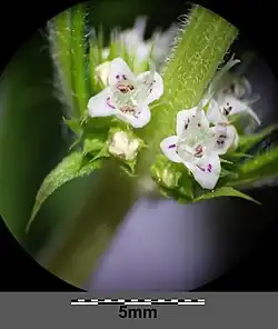 Die Blütezeit reicht von Juli bis September. Die Scheinquirle sind wenigblütig. Die weißen Blüten sind etwa 3 bis 4 Millimeter lang.[1] Die Kelchzähne stechen nicht und sind so lang wie die Kelchröhre. Die Lappen der Blütenunterlippe haben je einen roten halbmondförmigen Fleck.[1] Die Staminodien sind kopfig oder fehlen ganz.[1] Die Nüsschen sind fast so lang wie der Kelch.[1]