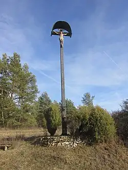 Das Kreuz ist etwa zehn Meter hoch und besteht aus Holz. Im Korpus des Kreuzes befindet sich eine Urkunde, aus der seine Geschichte hervorgeht. Demzufolge entstand es im Jahr 1834 und wurde von Maurermeister Aquilin Glückstein errichtet. Unbekannt ist jedoch, wer den Korpus schuf.