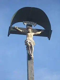 Der lebensgroße Korpus ist geschnitzt und farbig gefasst. Über dem Korpus befindet sich ein geschwungenes Metalldach. Die Kreuzbalken sind imprägniert; ihre Enden sind mit Blechen ummantelt. Am Stamm ist in Augenhöhe eine Lampe mit Kerzenlicht montiert.