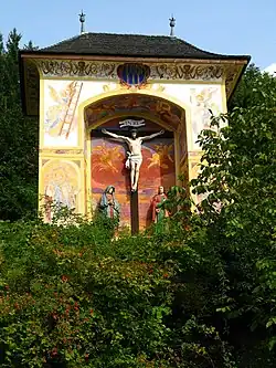 Die Wände sind mit Fresken ausgestattet: An der Schauseite ist die Passion und der Kreuzestod Christi zu sehen. In der Laibung der Nische und an den Außenwänden sind Engel mit Leidenswerkzeugen sowie der heilige Ignatius von Loyola und der Herzog Domitian dargestellt. An den Seitenwänden sind Johannes der Täufer und Franz Xaver wiedergegeben.
