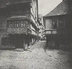 Das dreigeschossige Haus entstand etwa 1485 in Fachwerkbauweise und diente als Bäcker-Gildehaus. Die Giebelseite kragte vor, die Fachwerkfassade wies eine sogenannte Ständerreihung auf, darüber hinaus bestanden Fußstreben und Brüstungshölzer. An der Südfassade des Hauses befanden sich mehrere figürlich gestaltete Knaggen. Fünf im Obergeschoss, zwei im Erdgeschoss. Die Balkenköpfe waren als Birnstäbe gearbeitet.