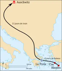 Am 13. Juli 1944 befahl Generalleutnant Ulrich Kleemann, Kommandant von Ost-Ägäis, die Festsetzung der Juden. Deportiert wurden von Rhodos zumindest 1.651 Frauen, Männer und Kindern, aus Kos zumindest 83.[48] Drei Schiffe aus Rhodos liefen am 24. Juli 1944 aus, eines aus Kos schloss sich an und sie verbrachten die Inhaftierten ins KZ Chaidari. Unmittelbar nach dem Abtransport der Juden setzte Kleemann eine Erfassungskommission für den Judennachlass ein.[49] Am 3. August wurden die Juden – mit dem letzten Deportationszug aus Griechenland – von Athen nach Auschwitz verbracht, wo sie nach 13 Tagen in Viehwaggons am 16. August 1944 eintrafen. 600 Menschen wurden für den Arbeitsdienst ausgesondert, alle anderen unmittelbar nach der Ankunft in den Gaskammern ermordet. „Nur 151 der von Rhodos Deportierten überlebten.“[50]