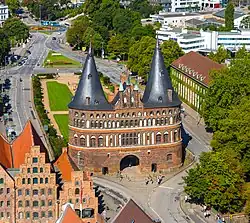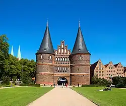 - Holstentorplatz 9, Holstentor. 1477 vollendetes Stadttor im Stil der Backsteingotik