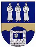 Blasonierung: „Im geteilten Schild oben in Blau drei silberne Mönche nebeneinander, unten in Gold ein fast bis zur Schildmitte hochgezogener blauer Dreiberg, belegt mit einem aus Feldsteinen gemauerten silbernen Ziehbrunnen einschließlich Eimer, der aus dem Schildfuß wächst.“[25][26] |