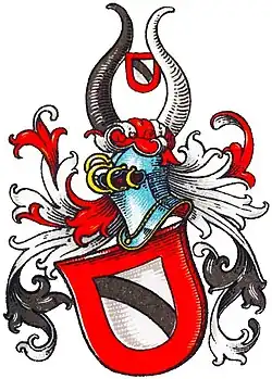 Blasonierung: In Rot ein silberner Herzschild, in welchem ein gebogener schwarzer Schräglinksbalken. Auf dem rot-silbern bewusteten Helm mit rot-schwarz-silbernen Helmdecken zwei Büffelhörner, rechts schwarz, links silbern, dazwischen der Schild.[1]