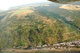 Luftbild des unteren Holzbachtals (Blüchertal) am rechten Bildrand, am oberen Bildrand in der Mitte ist Weisel zu erkennen, unten das Rheinufer mit Kaub | ||