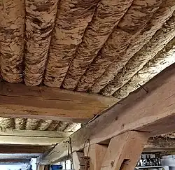 - An die Unterseite der Balken werden grob behauene Latten mit möglichst rauer Oberfläche oder trapezförmige Leisten genagelt, die als Putzträger fungieren (ältere Ausführung).