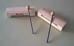 Der Holzblock ist ein Aufschlagidiophon, während die aus zwei Holzstäben bestehenden Claves zu den Gegenschlagidiophonen zählen.