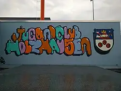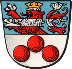 Der obere Teil des Ortswappens zeigt den hessischen Löwen und die drei Kugeln unten sind stilisierte Äpfel, die auf den heiligen Nikolaus hinweisen sollen.