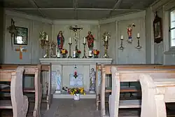 Das Innere der Kapelle ist weiß gestrichen. An der Rückwand über dem Altar bildet ein von den Figuren von Maria und Johannes flankiertes Kruzifix eine Kreuzigungsgruppe. Die Vorderseite des Altars ist als Heiliges Grab gestaltet.